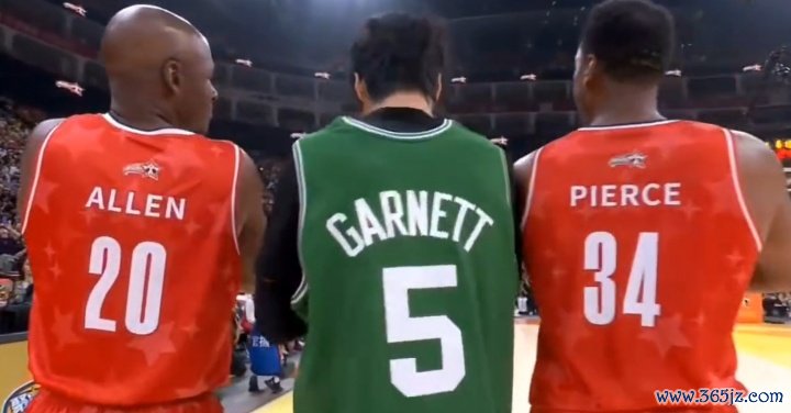 > - 吴勇豪身穿加内特运动活动 服 和皮尔斯&雷阿伦合照致敬绿军三巨头