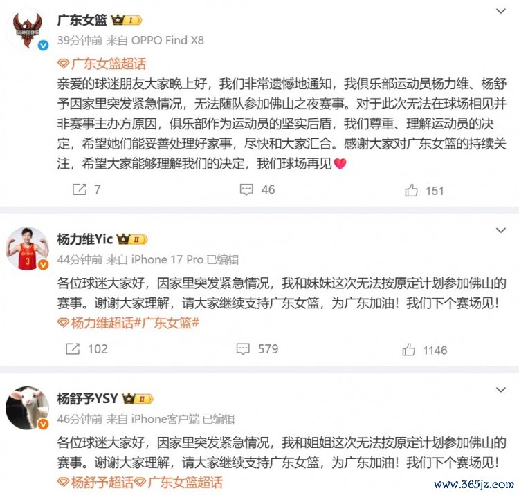 10月14日讯 广东女篮官方宣布,杨力维、杨舒予因家里突发紧急情况,无法随队参加佛山之夜赛事。