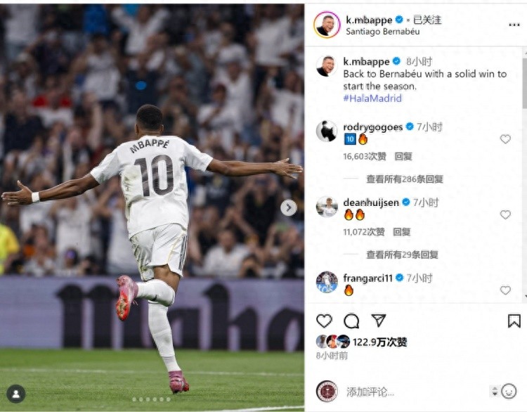 姆巴佩社媒晒出庆祝得分 的照片, 法甲新闻网西甲直播并配文:“重返伯纳乌, 巴塞罗那以一场扎实的获胜 开启新赛季。”