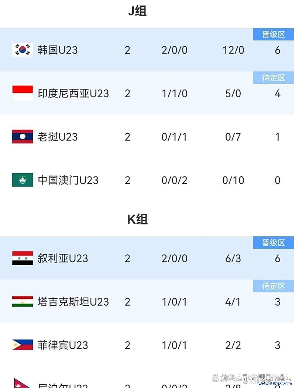 J组和K组:J组末轮韩国印度尼西亚直接对话,韩国不输国足优势,韩国输球,与国足净胜球同为+12,就看谁输更多;K组末轮塔吉克斯坦VS叙利亚,菲律宾VS尼泊尔,小组第二最多6分,国足不大败 ,大概率净胜球优势!