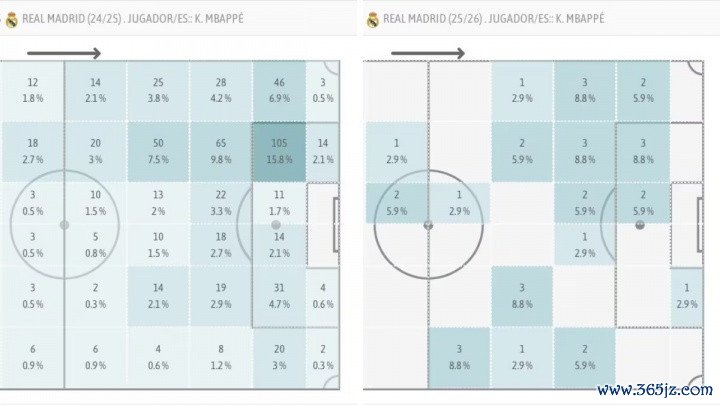 因为阿隆索明确告诉他,他不仅要撕咬对手,还要拥有自由。尽管数据样本尚少,但相比2024-25赛季,他的攻击 区域分布变化显著(见表格)。如果说之前他更多集中在左路危险区域 内外,现在的姆巴佩更像全能球员。他在左路、右路和中路区域的次数相当(各3次)。虽然只是三场赛事 ,但意图明确:少做“9号”,多做“10号”。