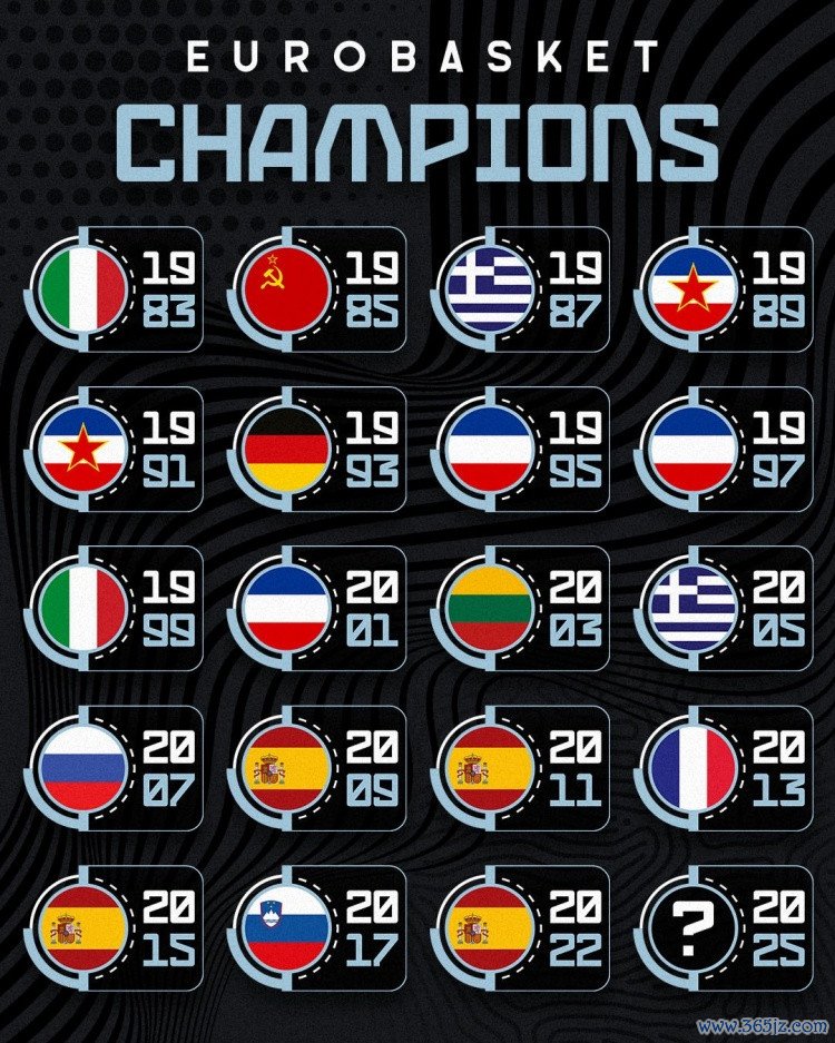 直播吧9月11日讯男篮欧锦赛已经产生了4强,欧锦赛官推晒出了过去19届男篮欧锦赛的夺魁 得主,篮球快讯西甲直播并发问:“哪支球队能创造新的历史?”