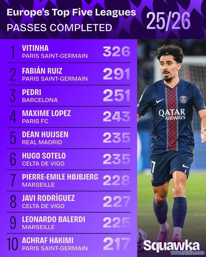 虎扑09月11日讯数据机构Squawka统计了本赛季以来,欧洲五大职业联赛 完成传送球 最多的前十名球员。来自巴黎的维蒂尼亚以326次排名第一,