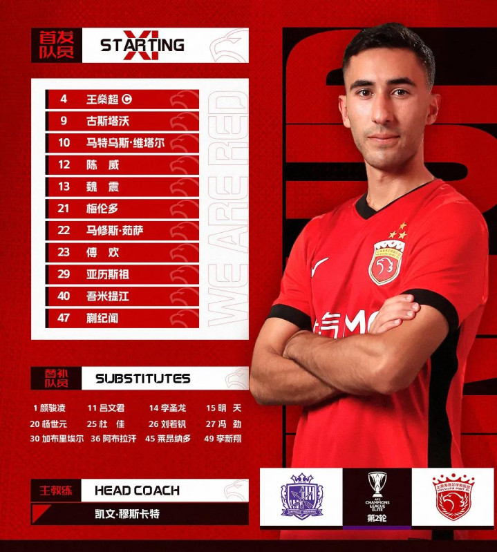 上海海港主帅穆斯卡特排出了4外援的杆位,古斯塔沃、茹萨、维塔尔与梅伦多联袂登场,小将蒯纪闻迎来亚冠首秀。