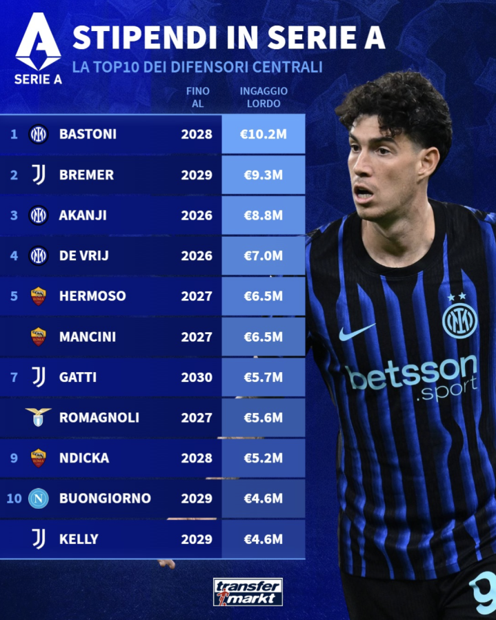 本赛季意甲中卫税前薪资榜: 巴斯托尼居首, 年薪超1000万欧